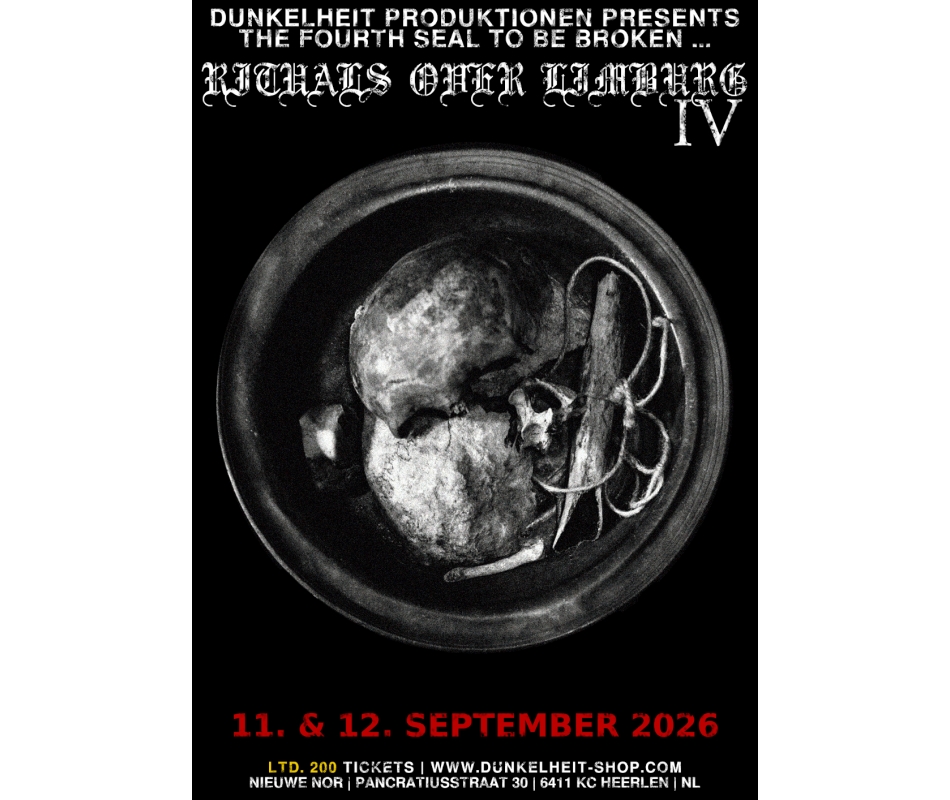 Following three successful rituals with international artists from the ritual, industrial, and ambient genres in the Limburg region (NL), we are thrilled to reopen the portal: Rituals Over Limburg IV. Dunkelheit Produktionen will exclusively present the most respected acts in the fields of ritual industrial, esotericism, and occult ambient. It's a unique opportunity to experience and feel these invocations firsthand. On September 11th and 12th, 2026, we invite you to open the portals with us: This time, we're focusing on emerging artists and names that have shaped the genre. Join us; we look forward to welcoming you to the event of the year...