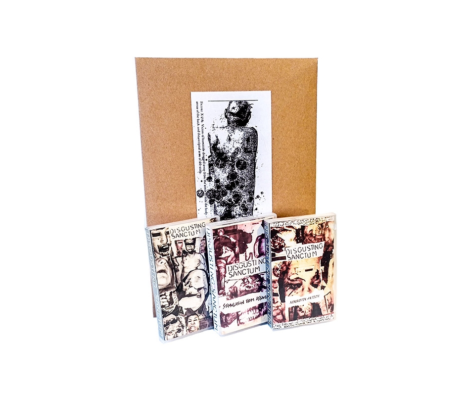 This release compiles all Disgusting Sanctum tapes on Black Psychosis into one re-issue. Tapes come in soft poly cases with pro printed colour j-cards all housed in an A5 manilla envelope with 12 page booklet and A4 inserts of Disgusting Sanctum collages used on the tape covers. The booklet uses the artwork from the old art edition booklet but A5 size, black and white and a rougher feel to it.